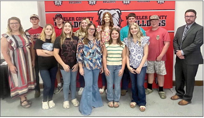4-H GROUP — From left, back row: Luke Bell, Layton Johnson, Chelsie Gruber, Alyssia Weeks, Martin Wynn, Fisher Thornton, and System Superintendent Dr. Aelex Alvarez; Nicole Thornton, UGA Extension, Anna Bowman, Alexis Ricks, Bryce Conner, Jocie Lanier, and Kinslee Fowler.