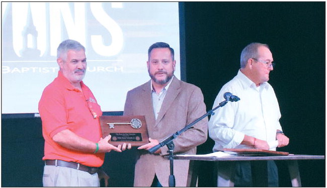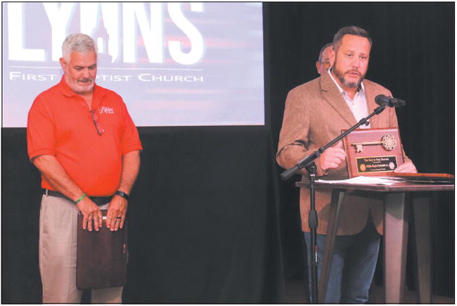 KEY TO THE CITY – City Manager Jason Hall (center) presents Mayor Willis NeSmith Jr. (left) with a key to the city after NeSmith was announced as the 2025 Lyons Citizen of the Year.Photo by Makaylee Randolph