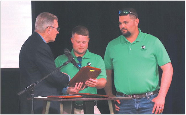 UNWAVERING LEADERSHIP – Lyons City Manager Jason Hall (right) told the audience several stories of the twelve years which he has worked alongside Mayor Willis NeSmithJr. (left), as he complimented NeSmith’s unwavering leadership.Photo by Makaylee Randolph