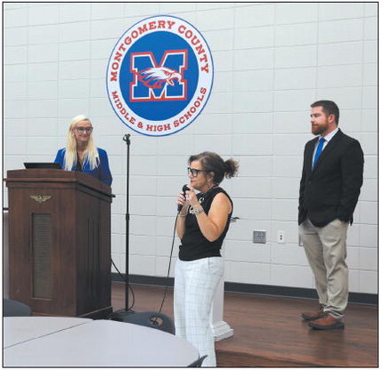 TITLE 1 MEETING – Montgomery County Elementary School Principal Candace Keen (left), Assistant Principal Will Adams (right), and Montgomery County Schools Federal Programs Director Julie Harrelson (center) address parents during the Title 1 meeting portion of the Eagle Expo.