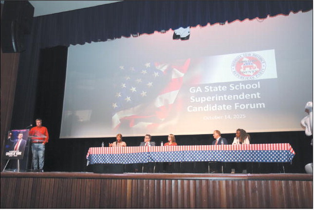 A FULL STAGE – Four State School Superintendent candidates came to Vidalia on Tuesday, October 14, for a candidate forum. L to R: Moderator Lawton Sack, Former State Representative Mesha Mainor, Dr. Randell Trammell, Toombs County Republican Party Chair and Event Host Trish Poole, Dr. Fred “Bubba” Longgrear, Dr. Nelva Lee.Photo by Makaylee Randolph