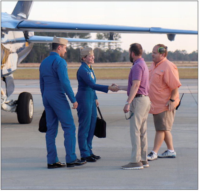 GREETING THE ANGELS – Vidalia Mayor Doug Roper and Vidalia Regional Airport Manager Billy Ragan greet U.S. Blue Angels Lieutenant Ronny Hafeza and Lieutenant Commander Lilly Montana after the pilots’ arrival on Thursday, November 20.Photo by Makaylee Randolph