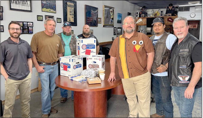 RIDING CLUB PROVIDES THANKSGIVING MEALS — Members of the Sons of Smoke motorcycle riding club partnered with three local pastors to provide complete Thanksgiving smoked-turkey dinners with all the ‘fixins’ to families in need in our community. The motorcycle riding group raises money all year long for charitable organizations and recipients in need, such as cancer patients and other worthy causes. Pictured left to right are Pastor J.D. Mitchell of Mount Vernon, Pastor Reece Mincey of Cedar Crossing, club founding members ‘Shanghai’ and ‘Big Show,’ Pastor Adrian Bell of Uvalda, club member “Migo’ and club President ‘Cuz.’ The group said the effort was a way to give to our community by sharing compassion and a warm holiday meal with neighbors. If you would like to donate to the club’s efforts, email them at cuz.sonsofsmoke@gmail. com.