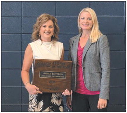 LYONS UPPER ELEMENTARY TEACHER OF THE YEAR – Reading Interventionist Amber Botelho was named the 2025 Lyons Upper Elementary School Teacher of the Year. L to R: Amber Botelho, Lyons Upper Elementary School Principal Tabatha Nobles.