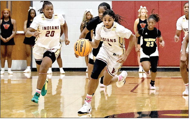 Ze Rollins pushes the ball up the court for the Lady Indians against Swainsboro.Photo by Pop-Pop’s Photos