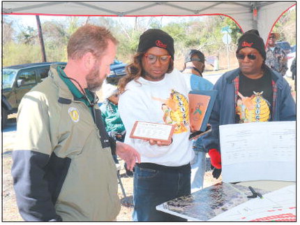 MARKING GRAVES – E.L.I.C.E. Members Rodney Wiggins (center) and Melissa Williams (right) show Mayor Doug Roper (left) the bricks which may be potentially used to mark currently unmarked graves.Photo by Makaylee Randolph