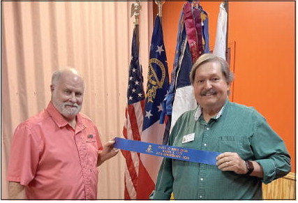 President Joel Keener, left, presents chapter flag streamer to Sgt.-at-Arms Dan Brown, right.